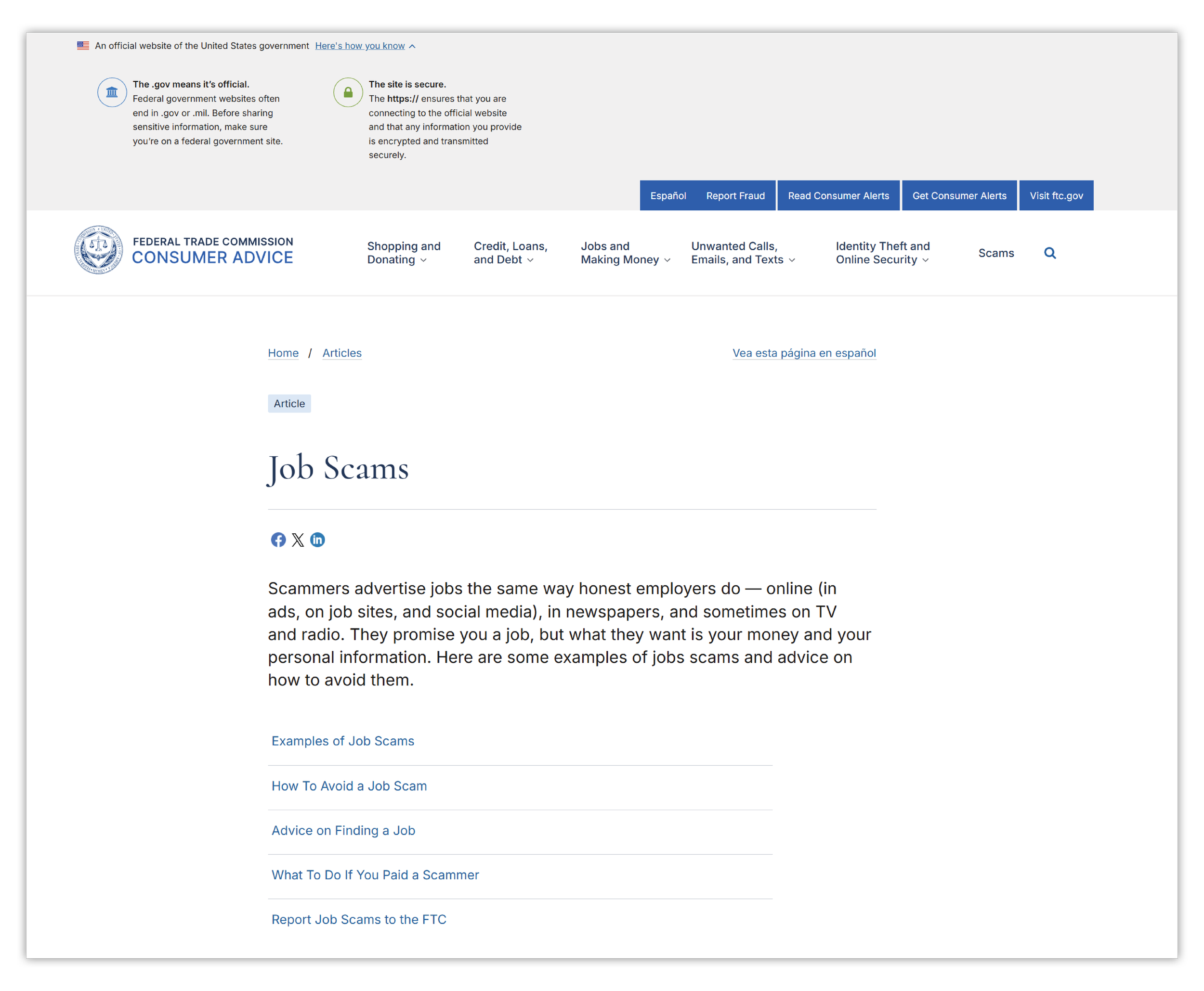 Learn how to recognize and protect yourself from job scams by reviewing guidance from the Federal Trade Commission (FTC) at https://ftc.gov/jobscams.